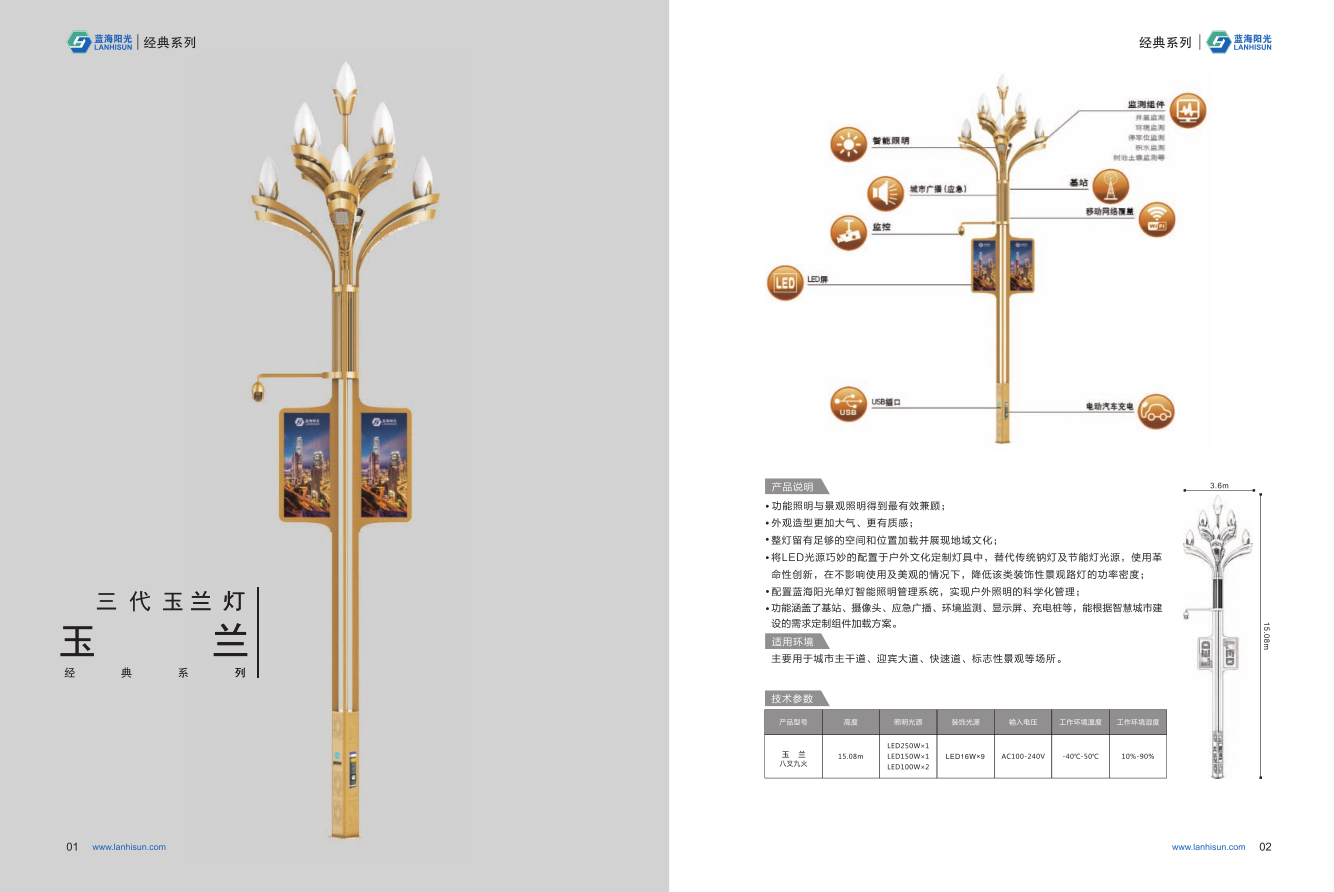 1、高度為6-16米; 2、花葉光源為4組LED光源,色溫2500-6500K,燈罩光源為9只LED裝飾光源,每個光源功率為30-60W; 3、LED驅(qū)動電源壽命可達五年; 4、整體熱鍍鋅噴塑,保證燈桿15年不生銹; 5、可以根據(jù)使用地區(qū)的地域文化、產(chǎn)業(yè)特點等進行文化定制;