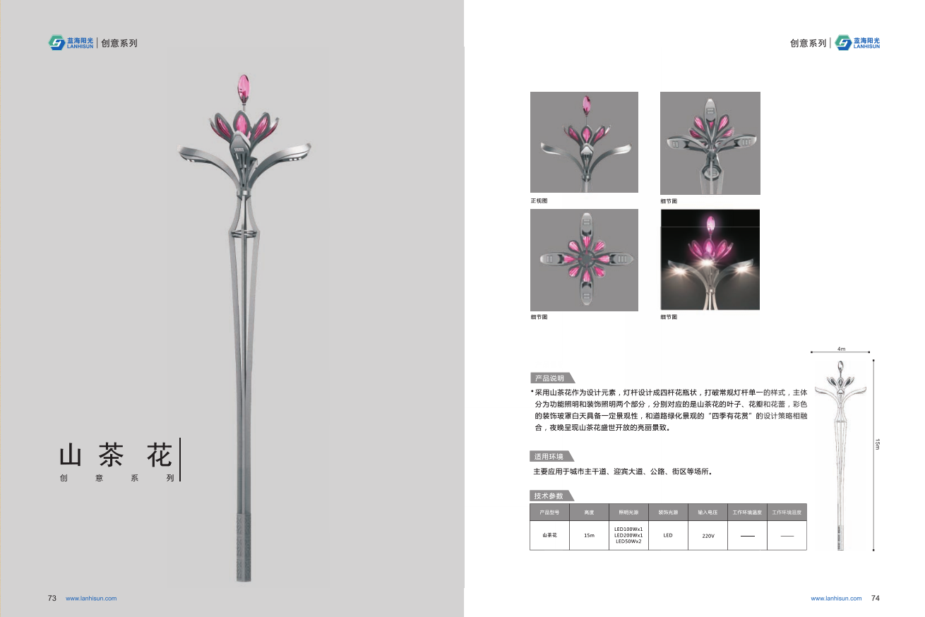 1、高度為6-16米; 2、花葉光源為4組LED光源,色溫2500-6500K,其余燈罩光源為LED裝飾光源,每個光源功率為30-60W; 3、LED驅動電源壽命可達五年; 4、整體熱鍍鋅噴塑,保證燈桿15年不生銹; 5、可以根據使用地區的地域文化、產業特點等進行文化定制;