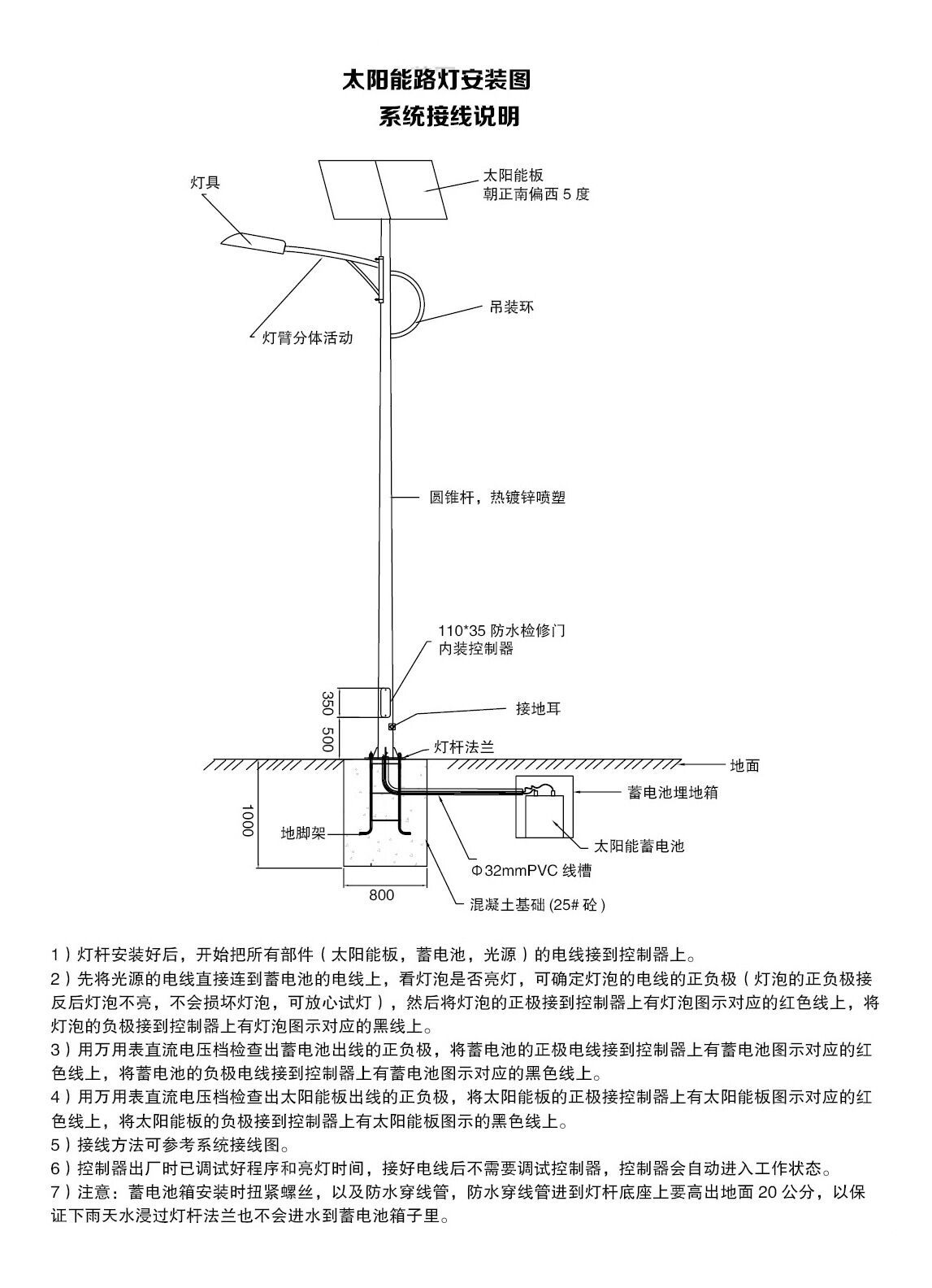 連接太陽能電池板和電池?:將太陽能電池板的正極與電池的正極相連,負極與負極相連,以便將產生的電能儲存到電池中。 ?連接電池和控制器?:將電池的正極與控制器的正極相連,負極與負極相連,以便將電池的電能傳輸到控制器中。 ?連接控制器和燈具?:將控制器的正極與燈具的正極相連,負極與負極相連,以便將控制器產生的電能傳輸到燈具中,供其照明使用。 在接線過程中,需要注意